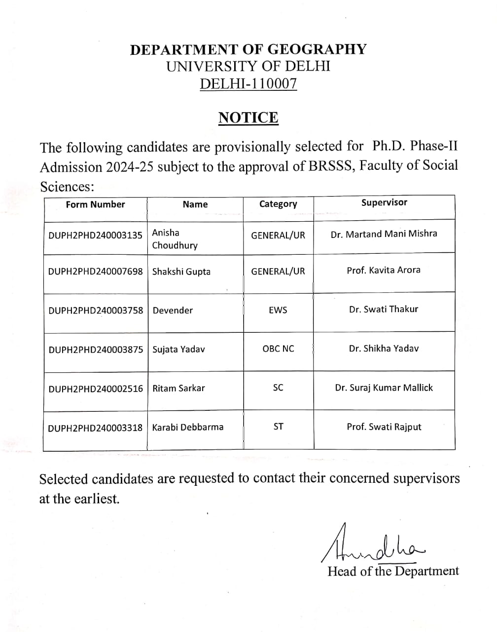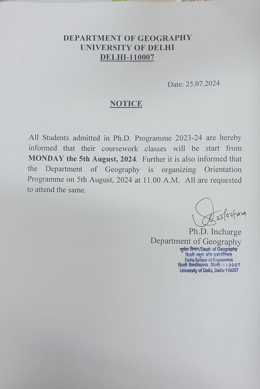 - All concerned may please note that PhD (Phase II) interviews will be held from 10 am onwards on May 26 and 27 at the Department of Geography, Delhi School of Economics, University of Delhi. Day-wise interview schedule under Ph.D. admission (Phase II) [Click Here]