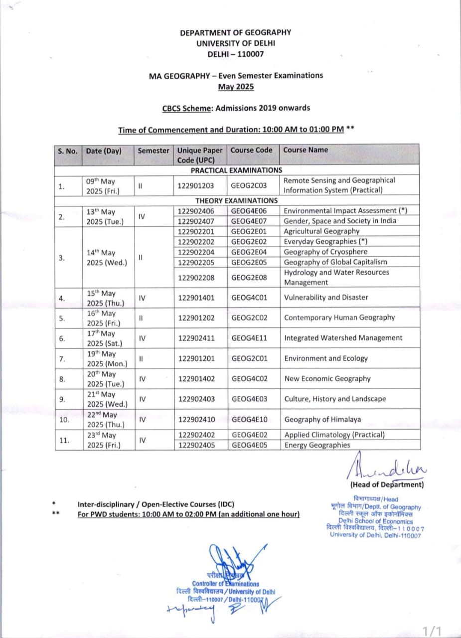 - Geography Postgraduate Curriculum Framework (PGCF) 2024 for Semester-I and Semester-II [Click Here] & Session 2025-26: MA Geography Time Table (Semesters I and III) [Click Here]